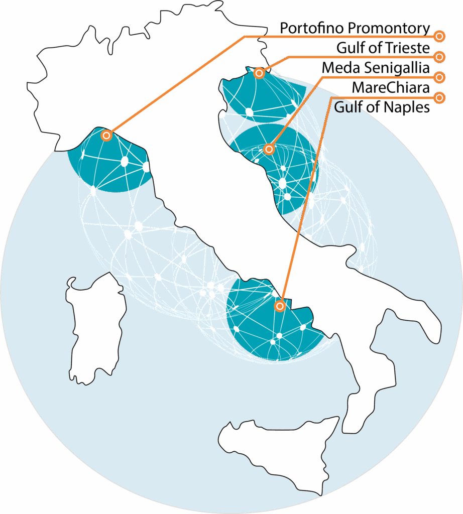 The Network is composed of four Observatories located along the Italian coast, namely: Promontory of Portofino, Gulf of Trieste, Meda Senigallia, and MareChiara Gulf of Naples. These Observatory stations also belong to the European Long-Term Ecological Research (eLTER) network. Each Observatory conducts continuous, long-term observation of its marine site and the consistent collection of samples for omics analyses and data over time.